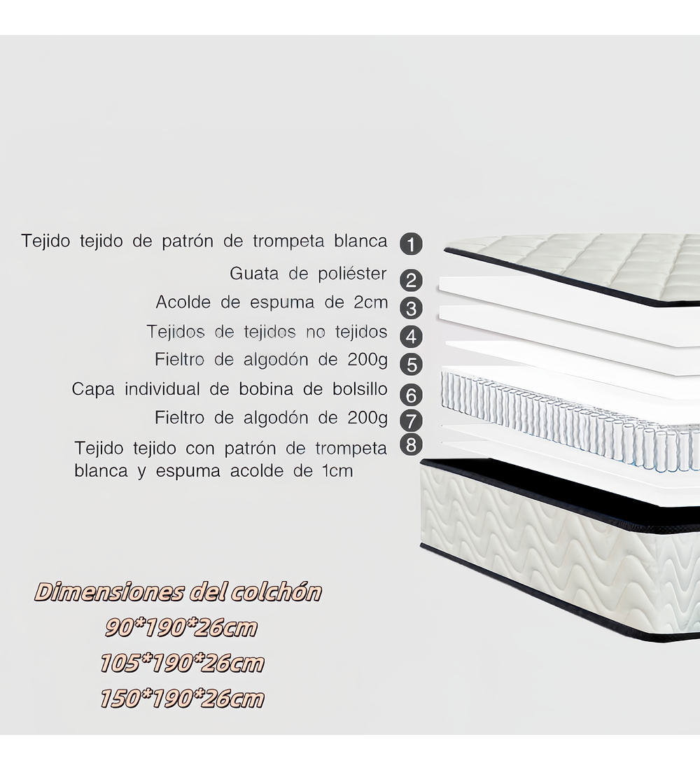 Construido con 8 capas de materiales de alta calidad, este colchón combina espuma y resortes Pocket Spring, lo que proporciona un soporte firme y a la vez suave, adaptándose al cuerpo y reduciendo la transferencia de movimiento, ideal para parejas. El sistema de resortes Pocket Spring permite que cada resorte funcione de manera independiente, mejorando la ergonomía y garantizando una mayor durabilidad.