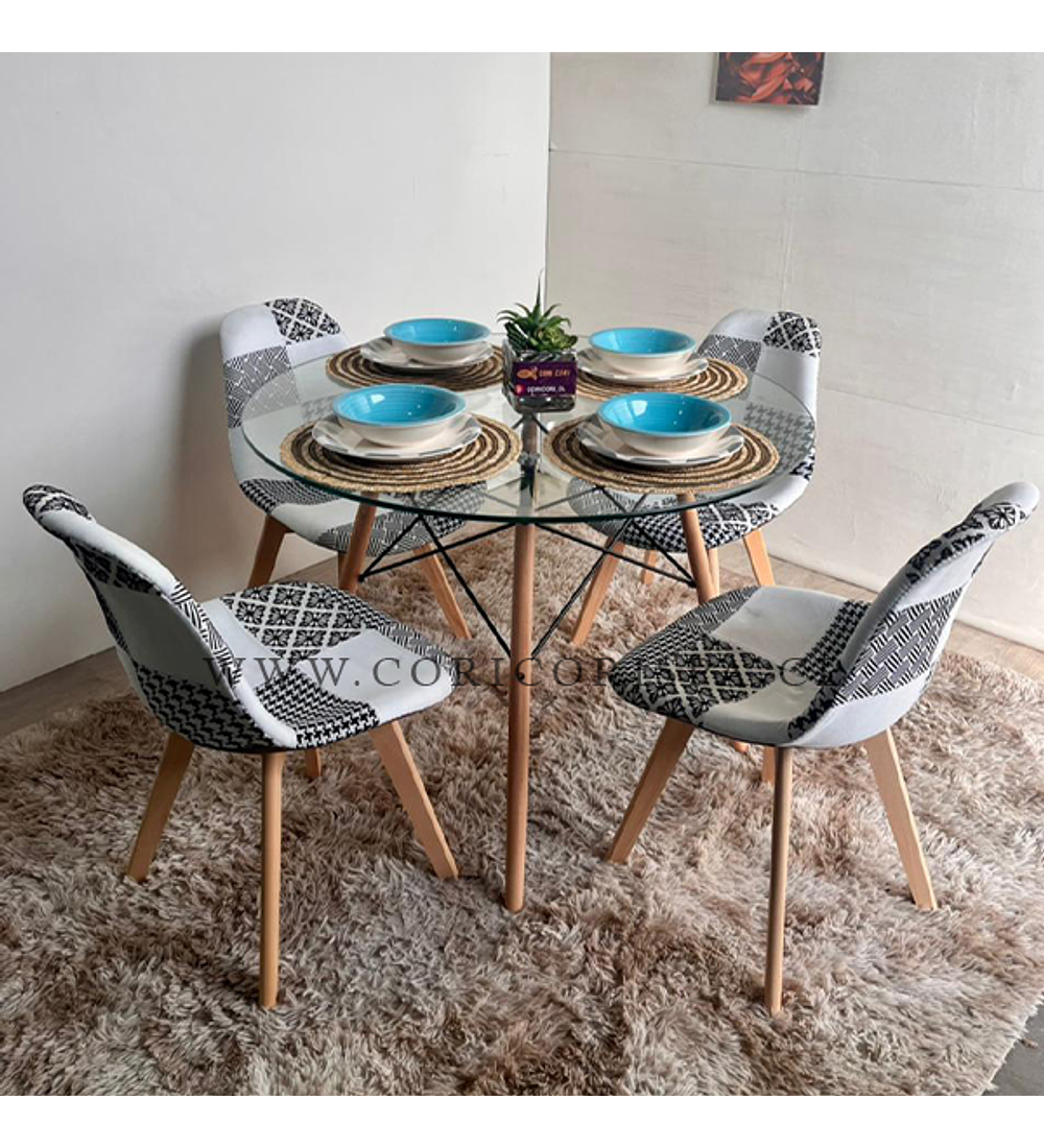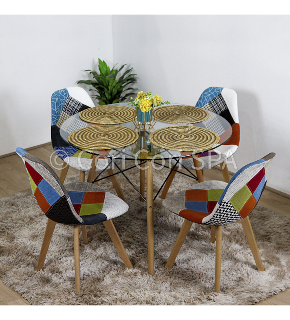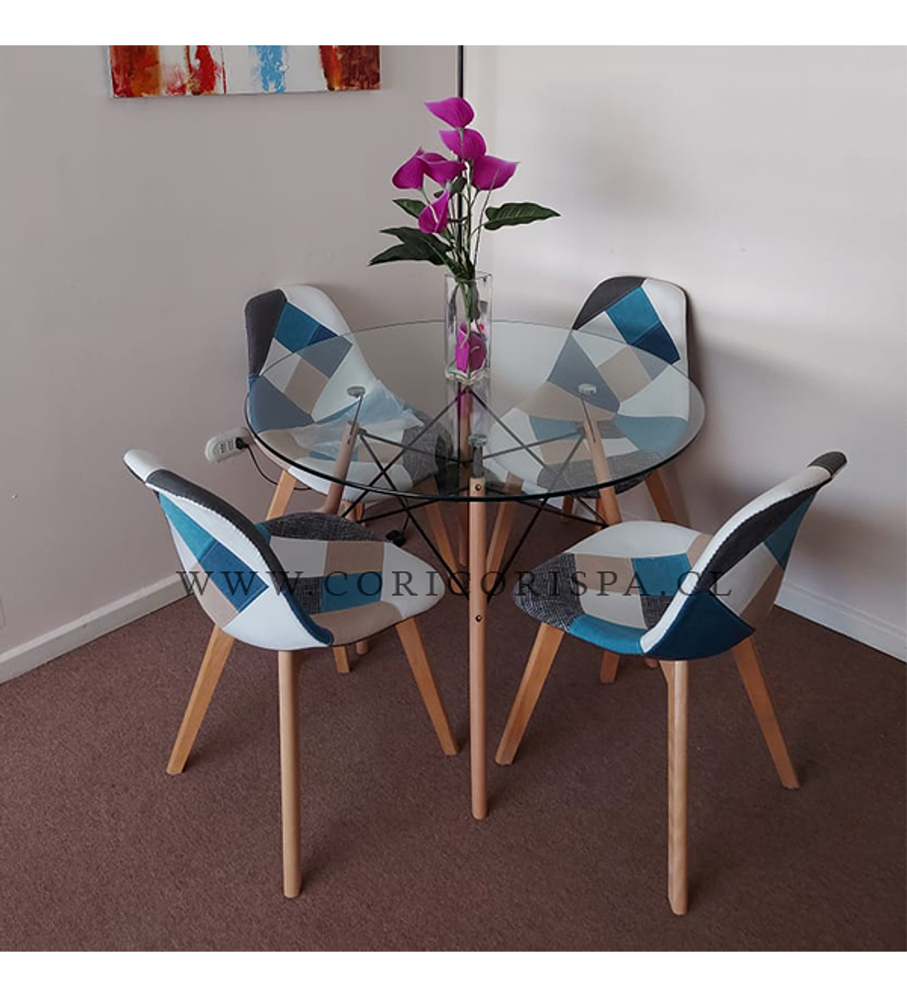 Comedor Eames Vidrio 80cms + 4 Sillas Patchwork Wood