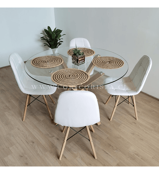 Comedor de esa Medlock Light de cristal de 10 mm de grosor, con unas estilizadas y resistentes patas en forma de X, acompa;ada de 6 sillas Capitonne de patas wood y tapizado en tela de lino