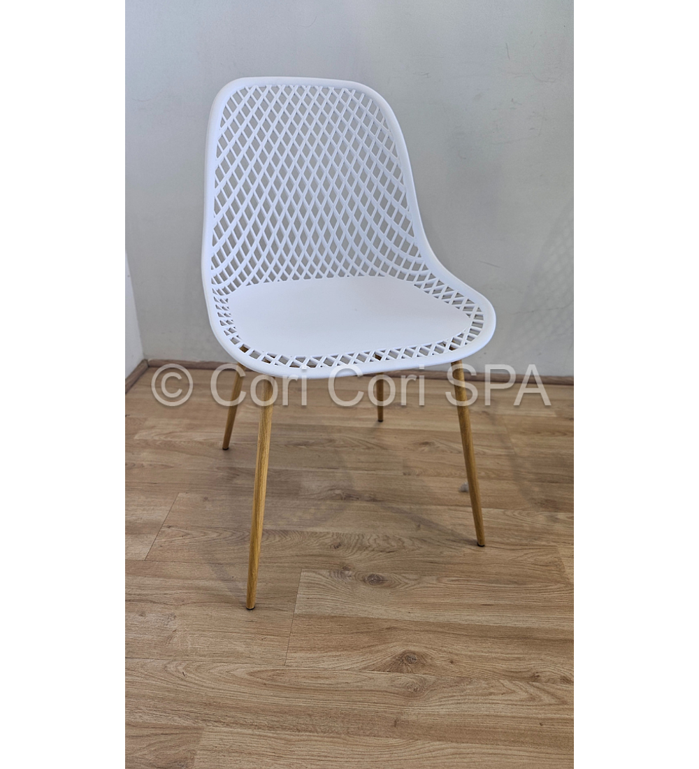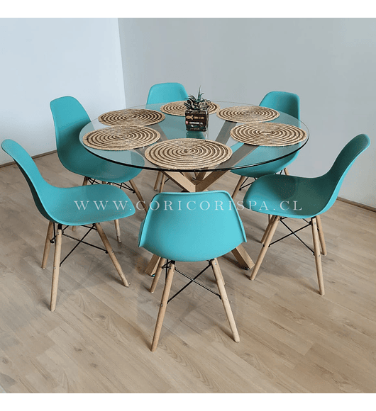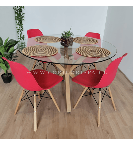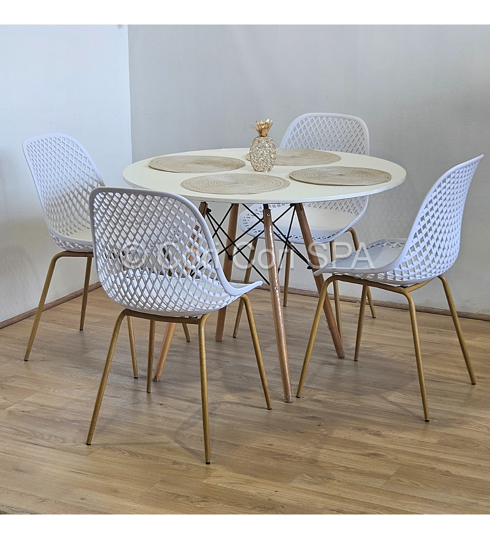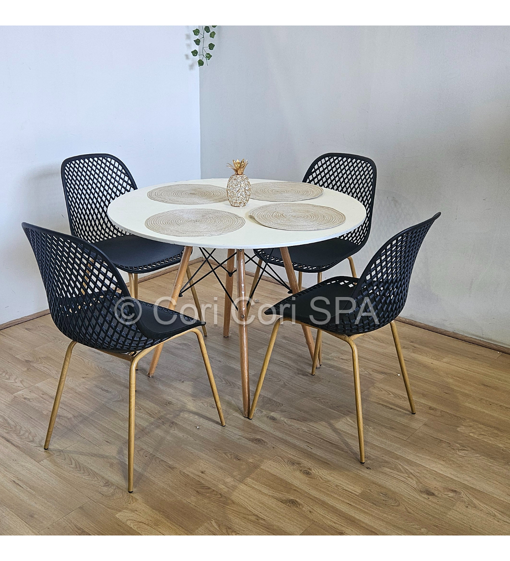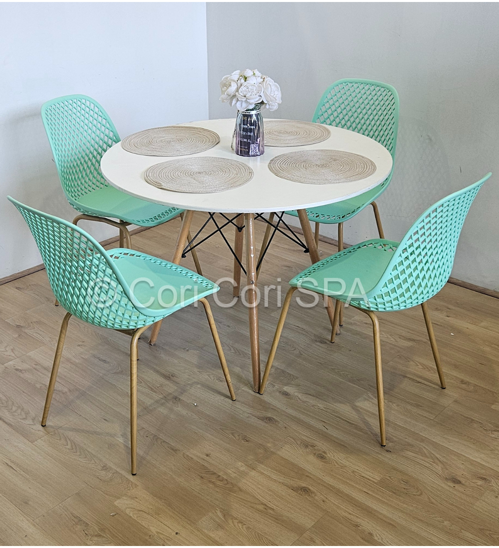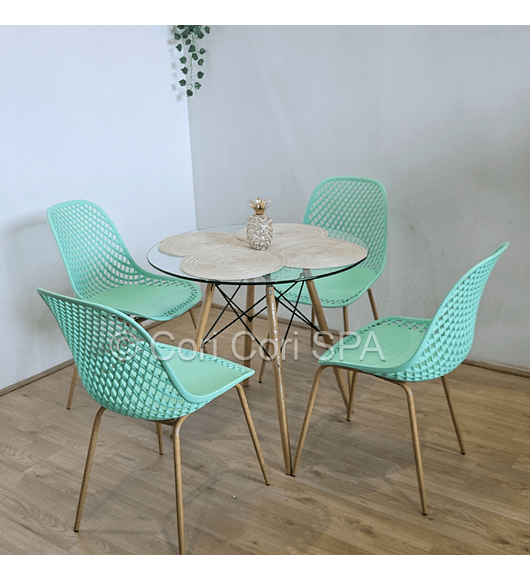 Maravilloso comedor con mesa de EAMES de 80cms acompañada de 4 Sillas Panal diseñadas en Polipropileno. con patas de METAL COLOR madera Excelente para exteriores