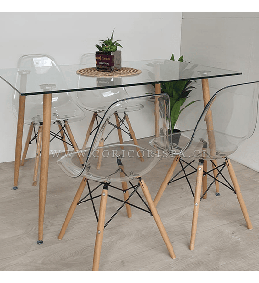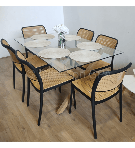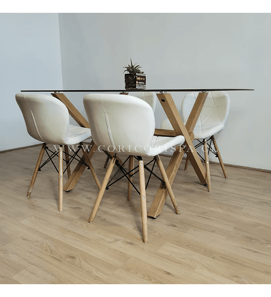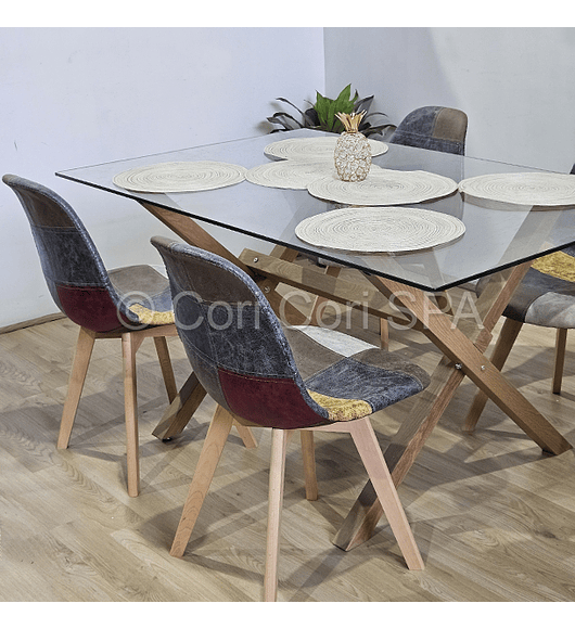 Una mesa de comedor de diseño minimalista, un resistente cristal de 8 mm de grosor, con unas estilizadas y resistentes patas en forma de X acompañada de 6 Sillas Patchwork tipo Wood de Ecocuero
