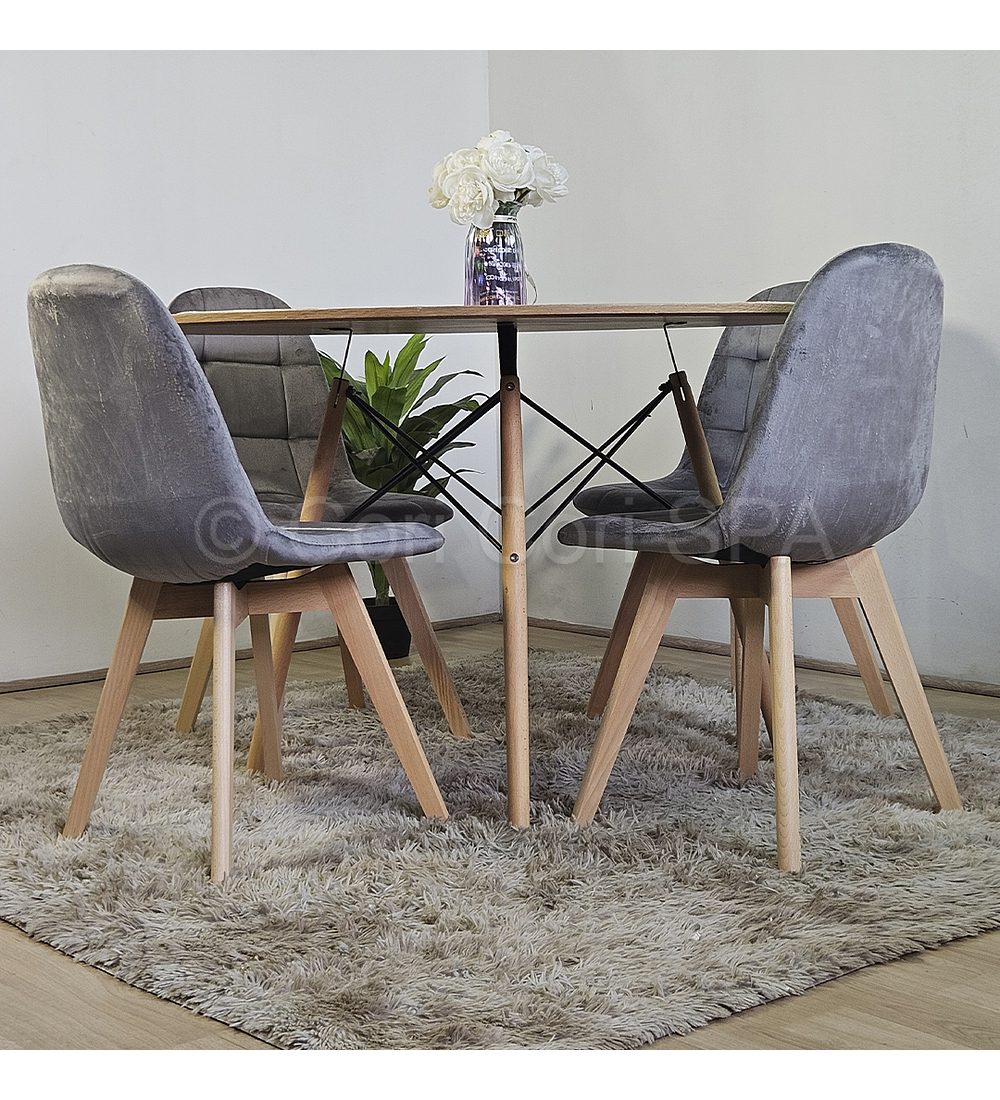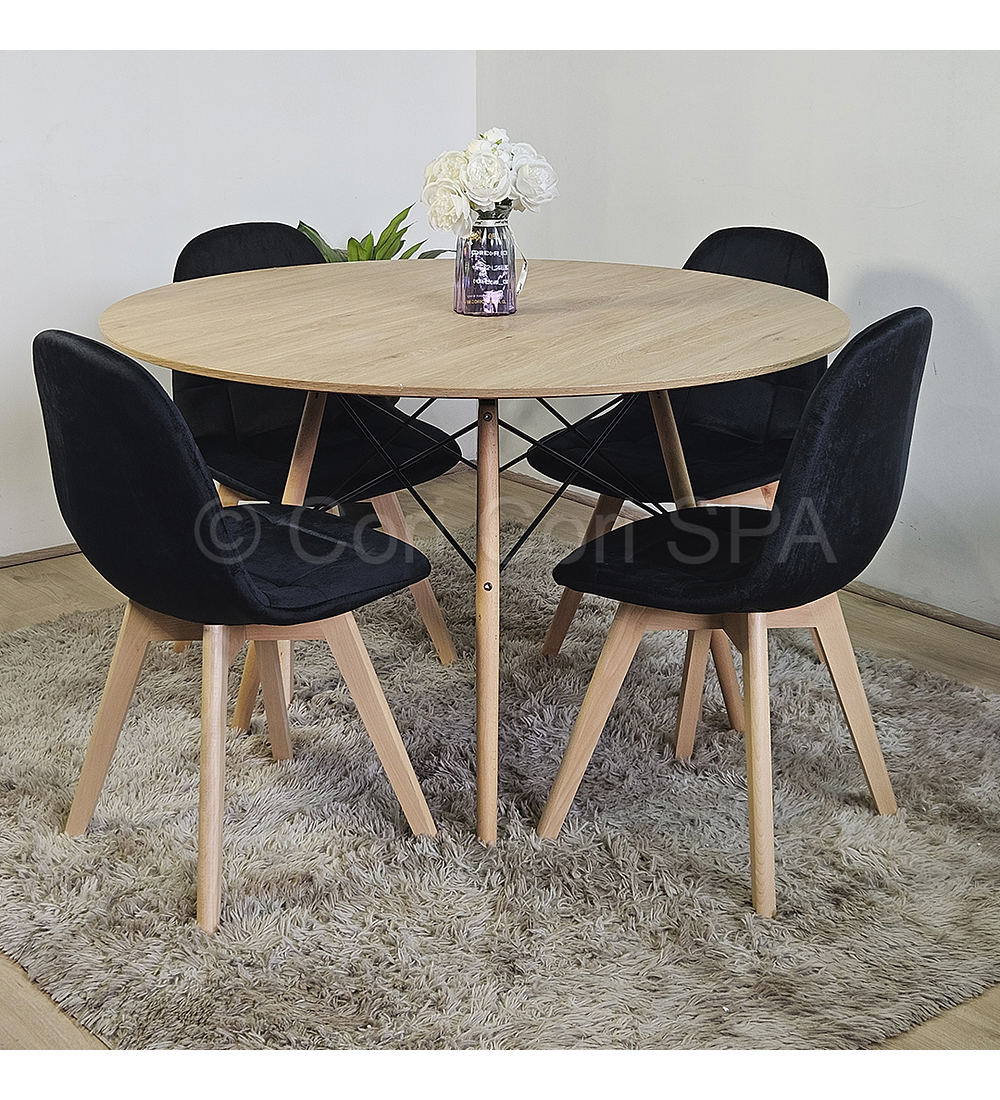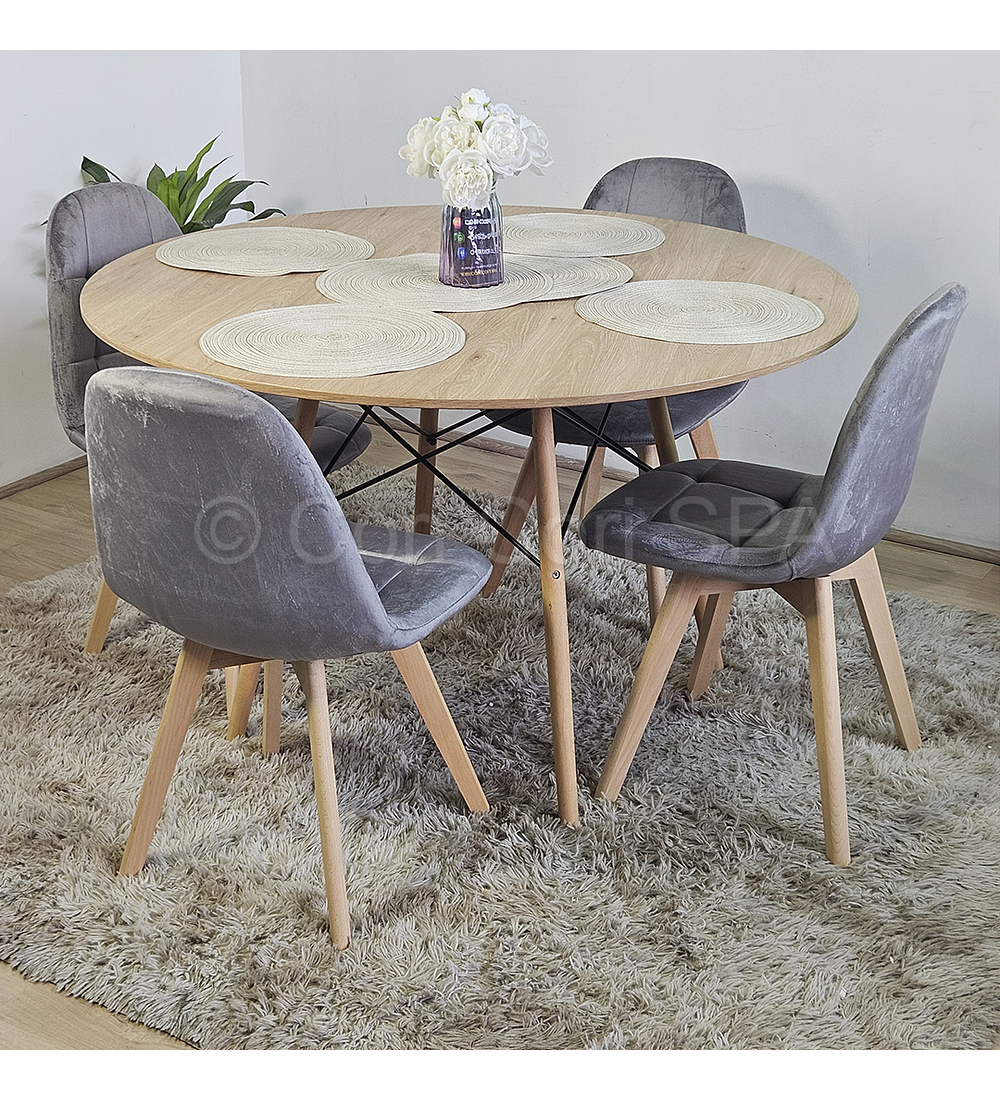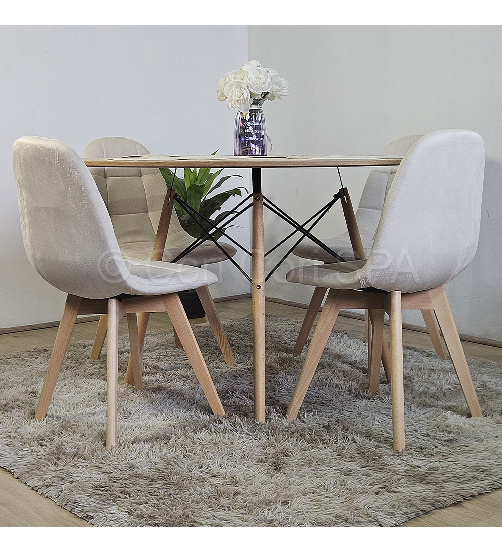 Mesa con cubierta de 120cm de diámetro hecha de melamina con un efecto acabado madera . Acompañado de 4 sillas Capitonne Velvet disponible en tres colores para que usted elija la mejor opción y combinación para su hogar.