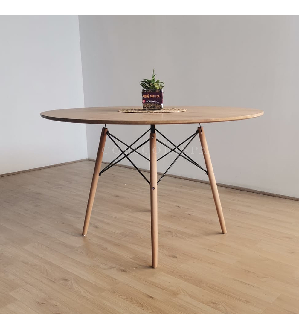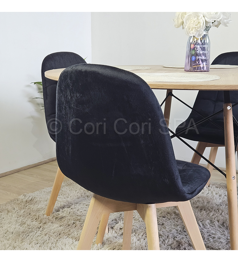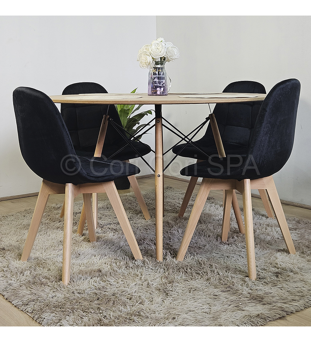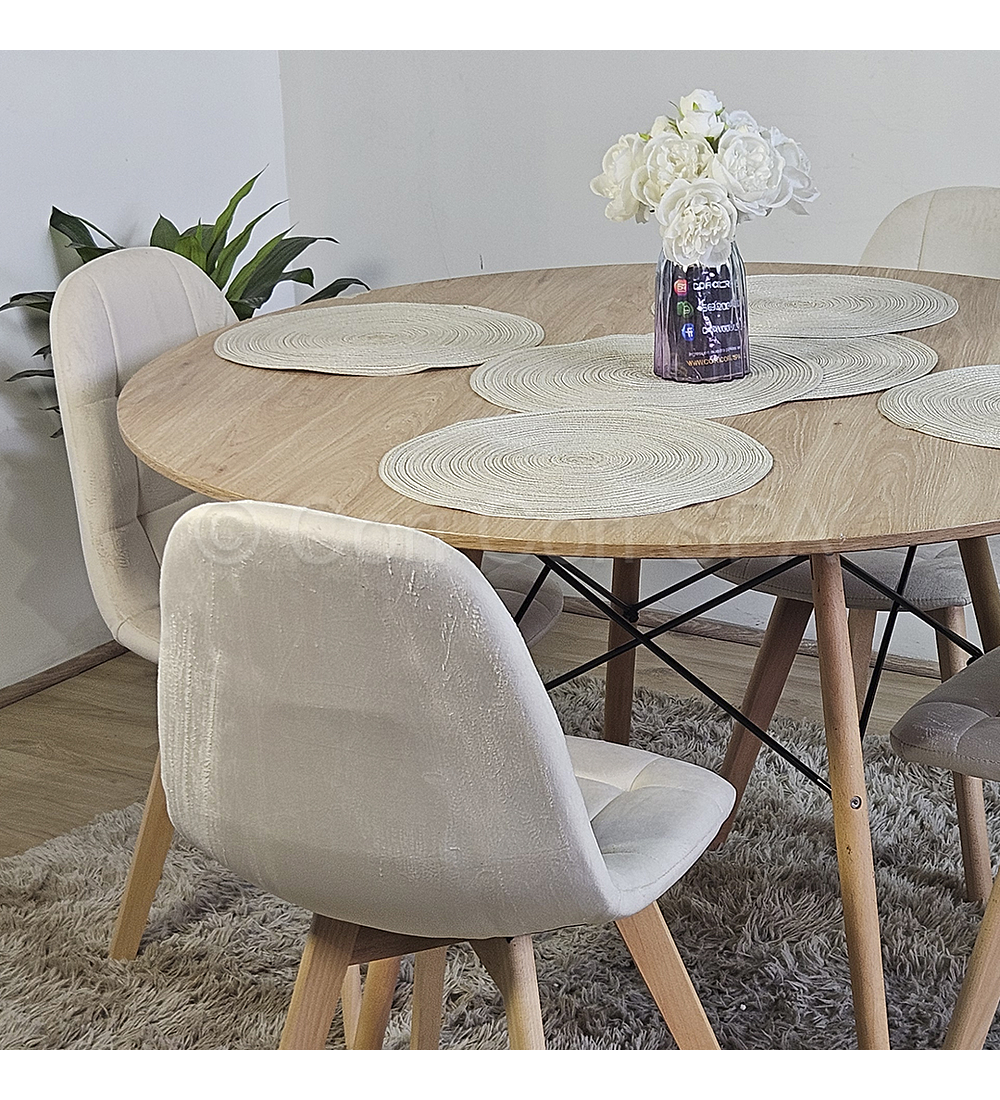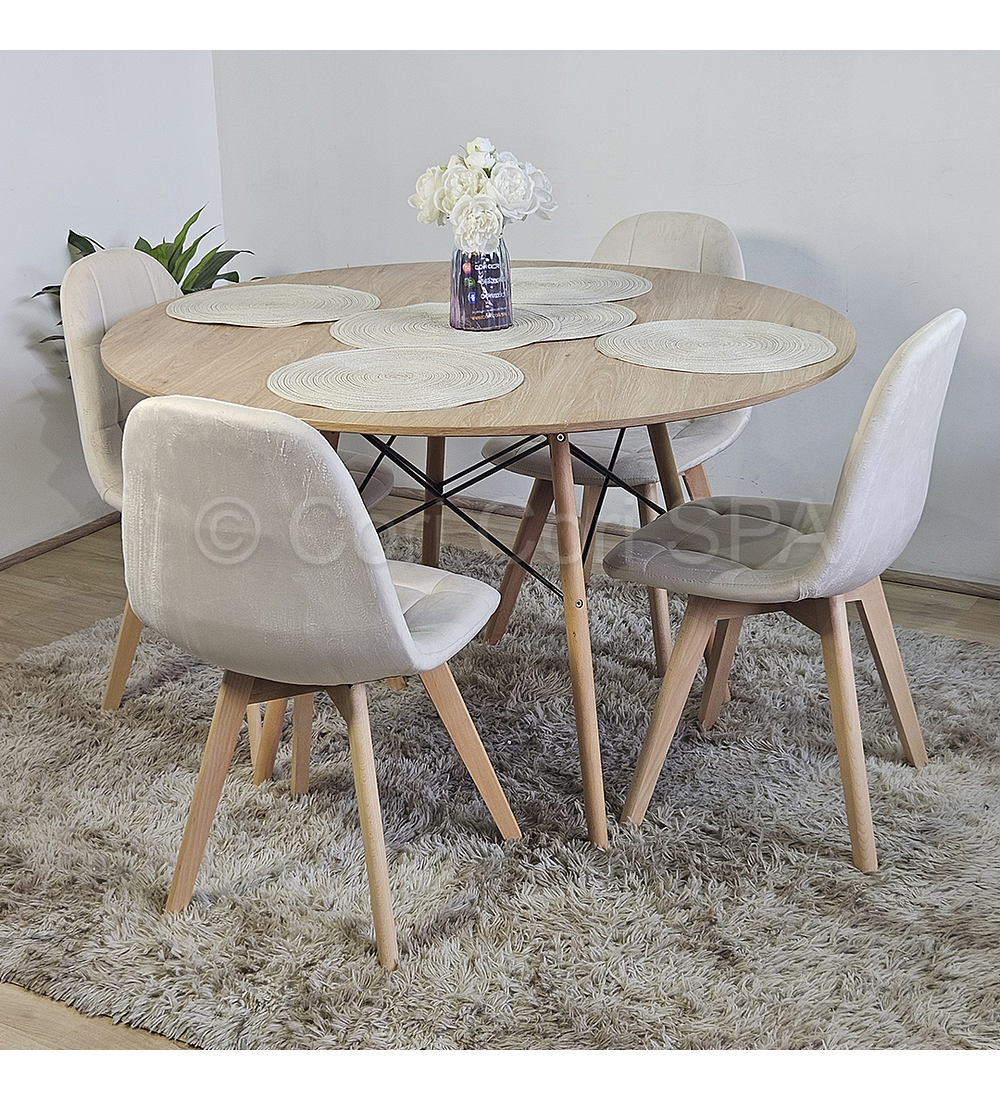 Mesa con cubierta de 120cm de diámetro hecha de melamina con un efecto acabado madera . Acompañado de 4 sillas Capitonne Velvet disponible en tres colores para que usted elija la mejor opción y combinación para su hogar.