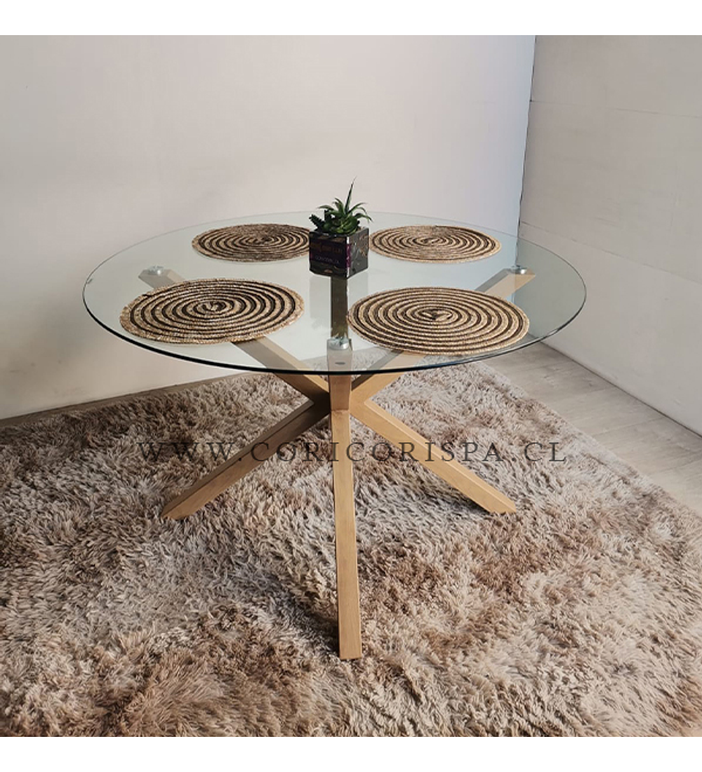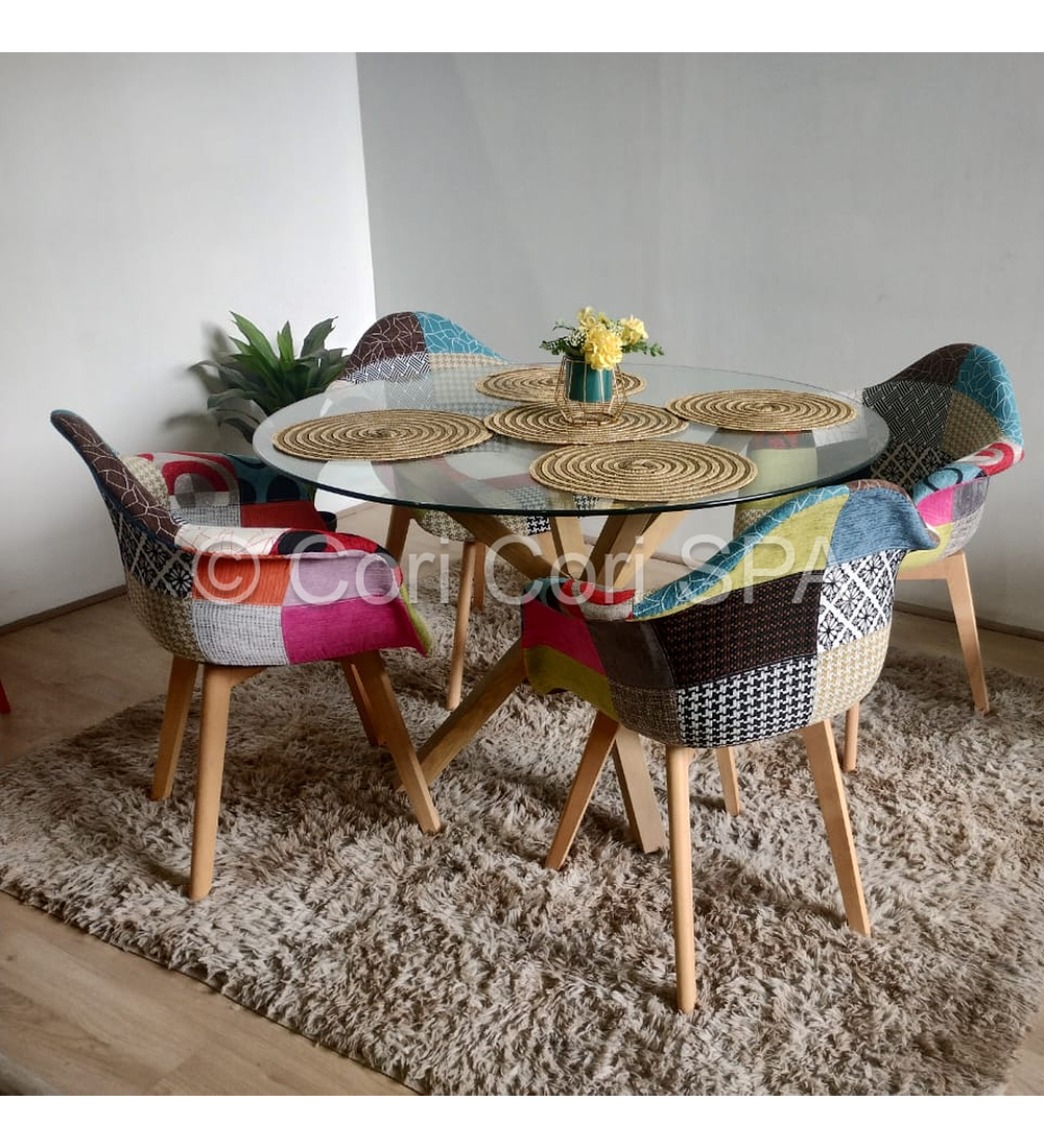 Comedor de Mesa de 100cm de diámetro Warwick, con una cubierta de vidrio de 10mm de grosor hermosa y resistente; acompañada de 4 Butacas Tipos Patchwork Wood