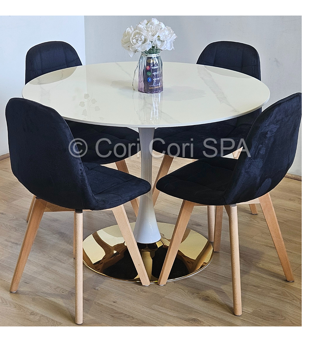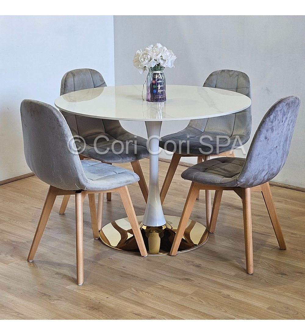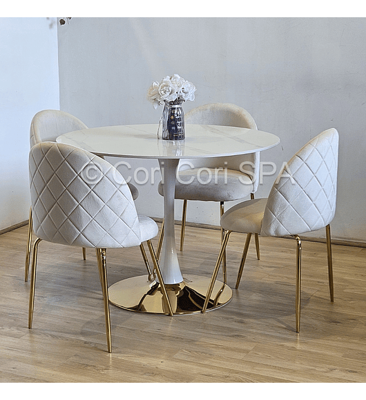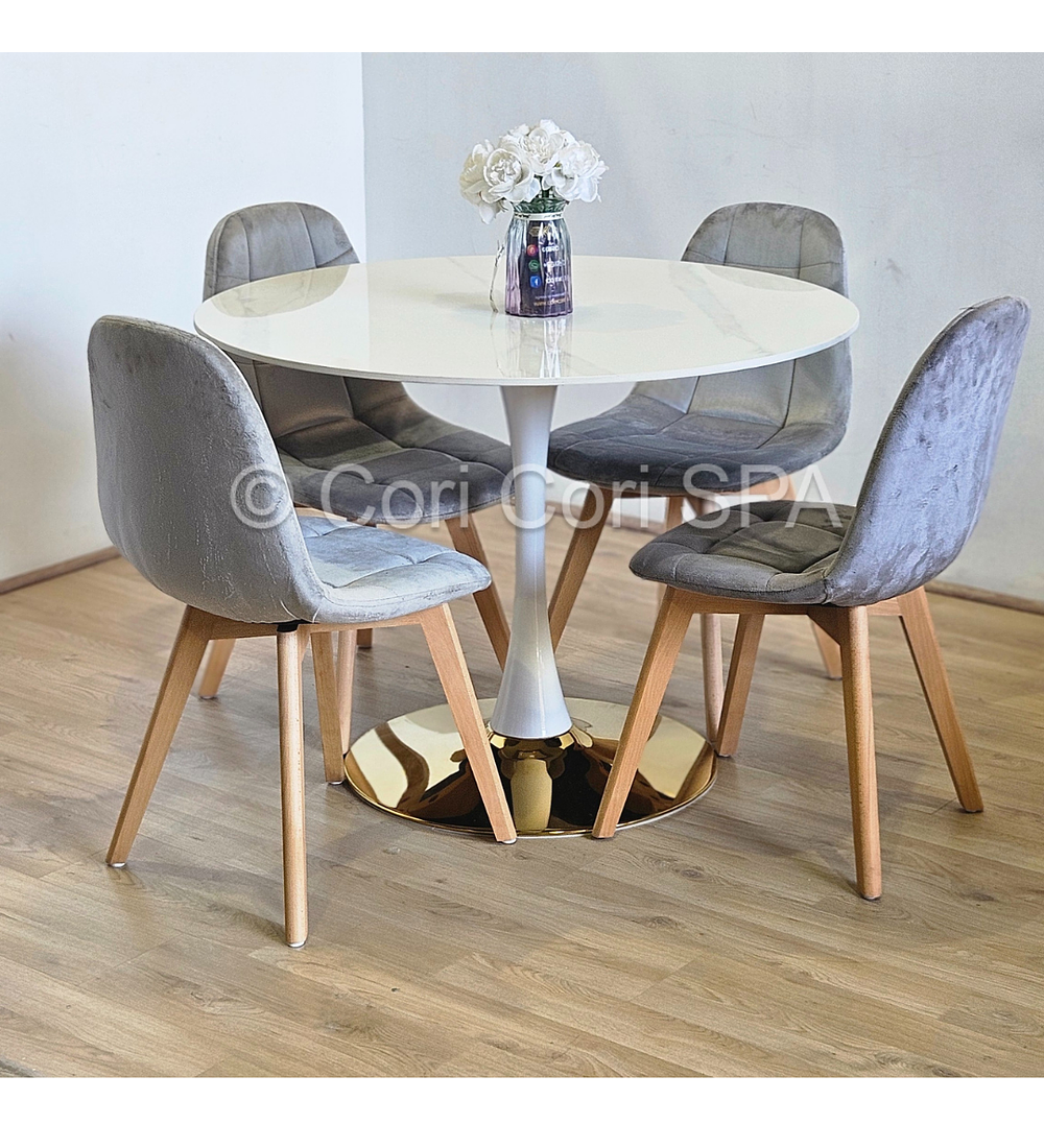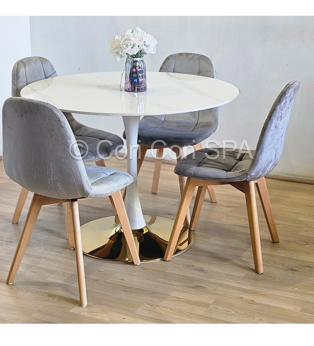 Comedor Tulip Gold Mármol 100cm + 4 Sillas Capitonne Velvet