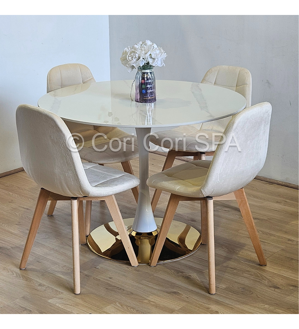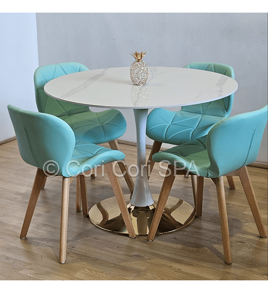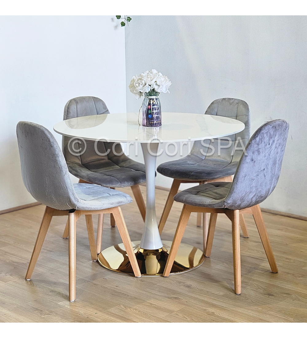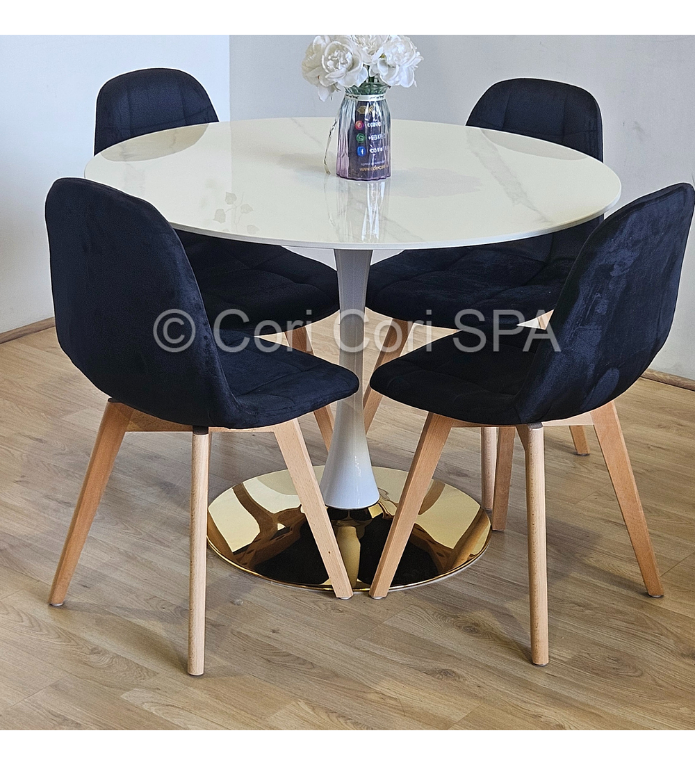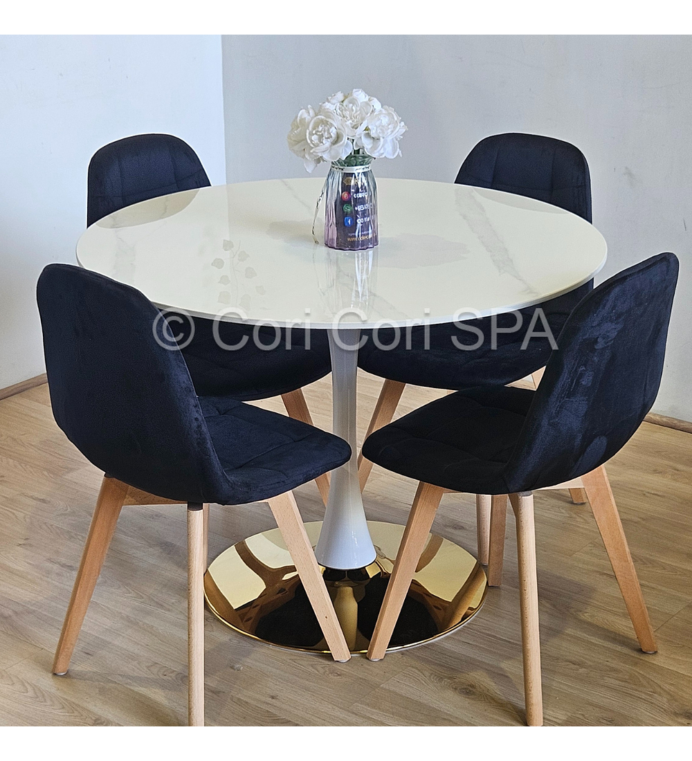 Comedor Tulip Gold Mármol 100cm + 4 Sillas Capitonne Velvet