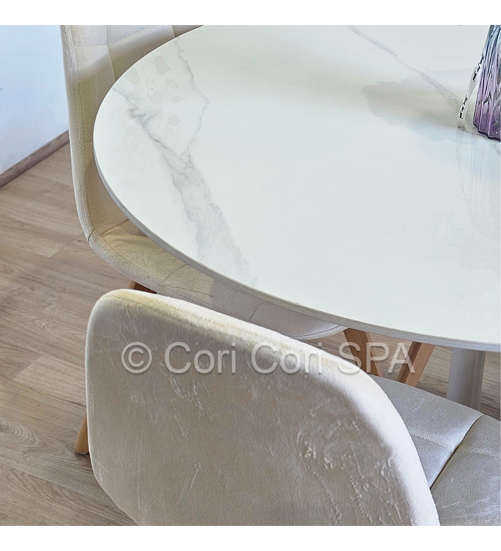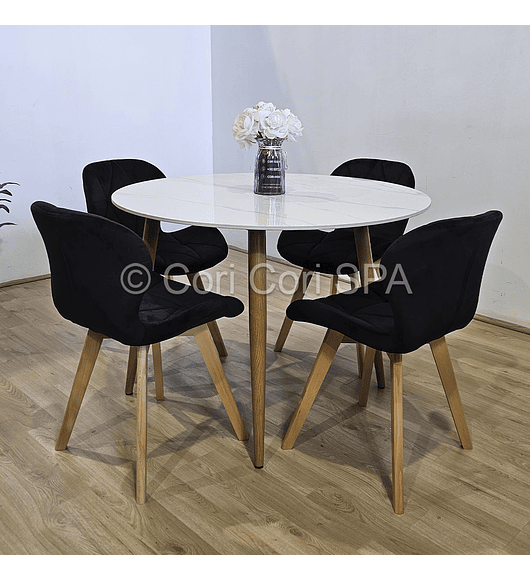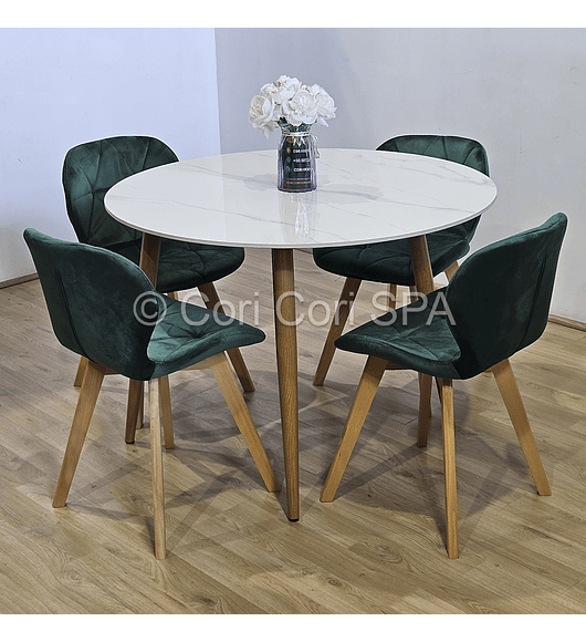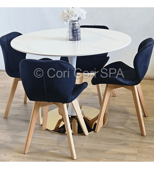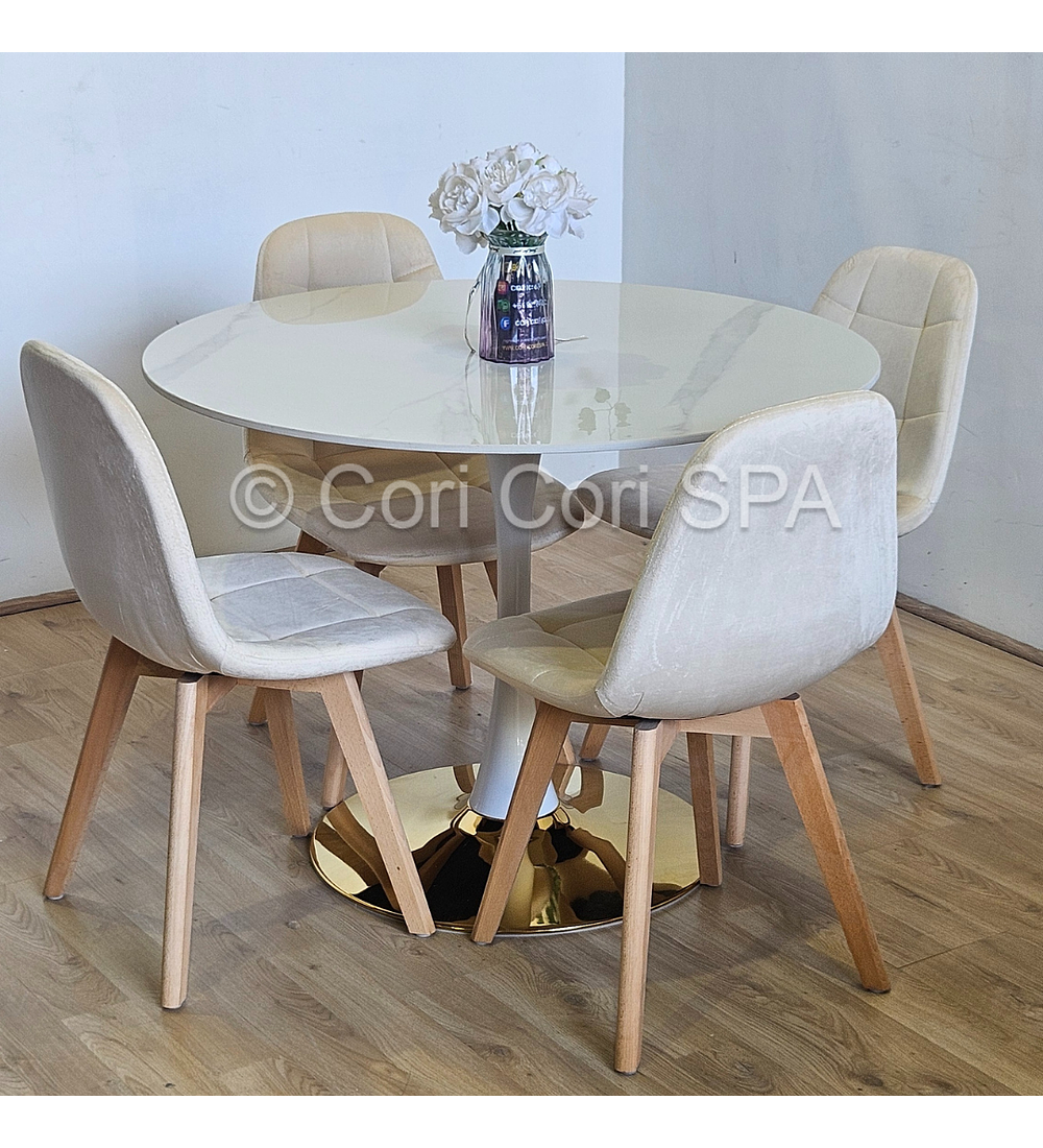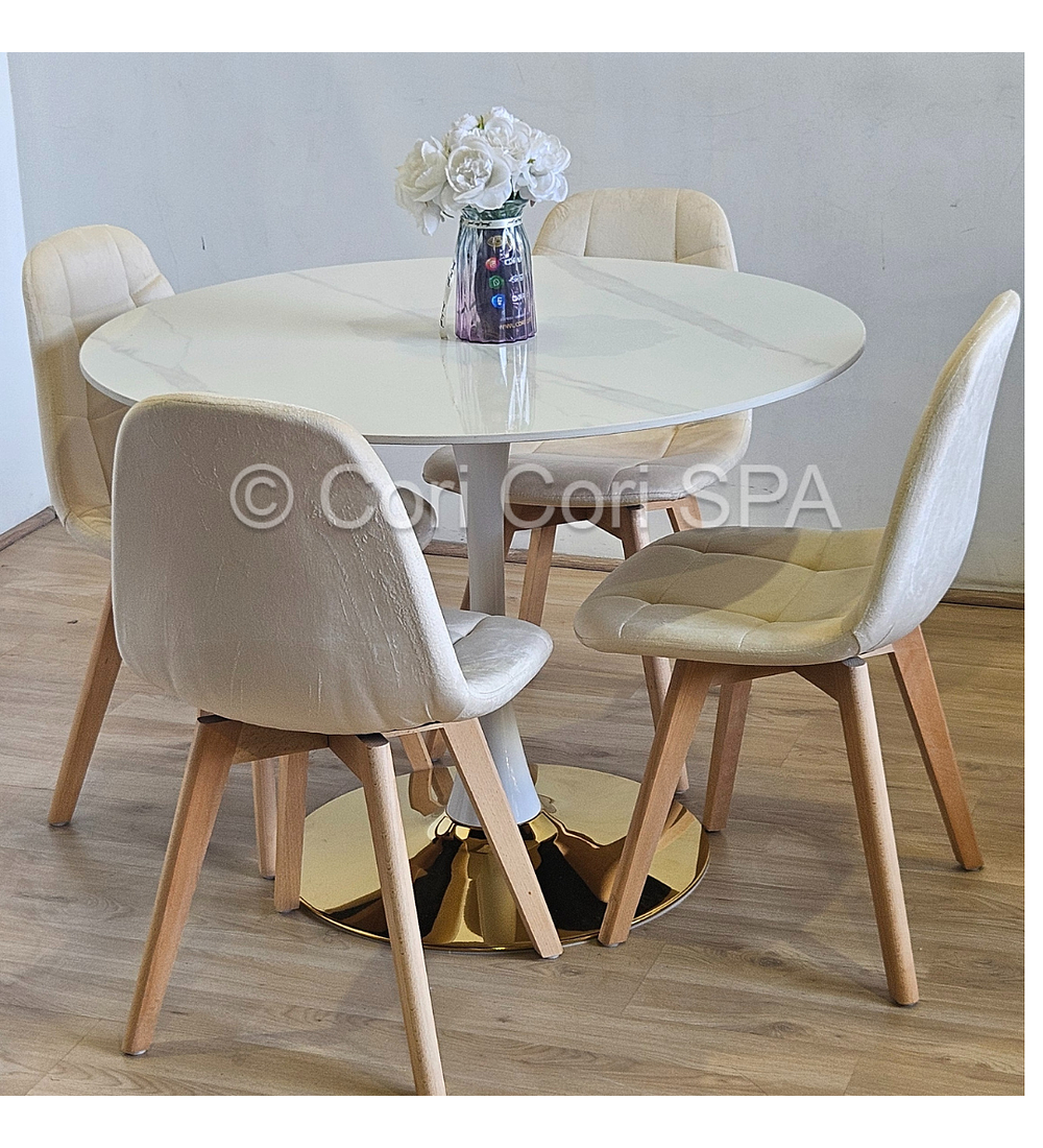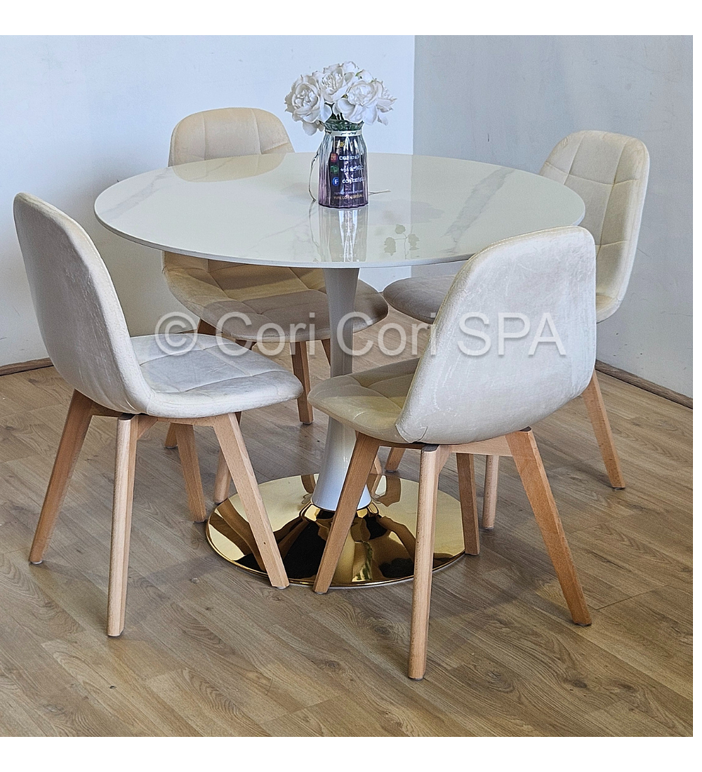 Comedor Tulip Gold Mármol 100cm + 4 Sillas Capitonne Velvet
